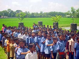 誰かが見張っていたのだろうか。バスが学校に近づいた頃、先生と子どもたちが教室から走って出てきた。これがバングラデシュかと疑うほど、皆すばやく整然として校庭に列を作った。